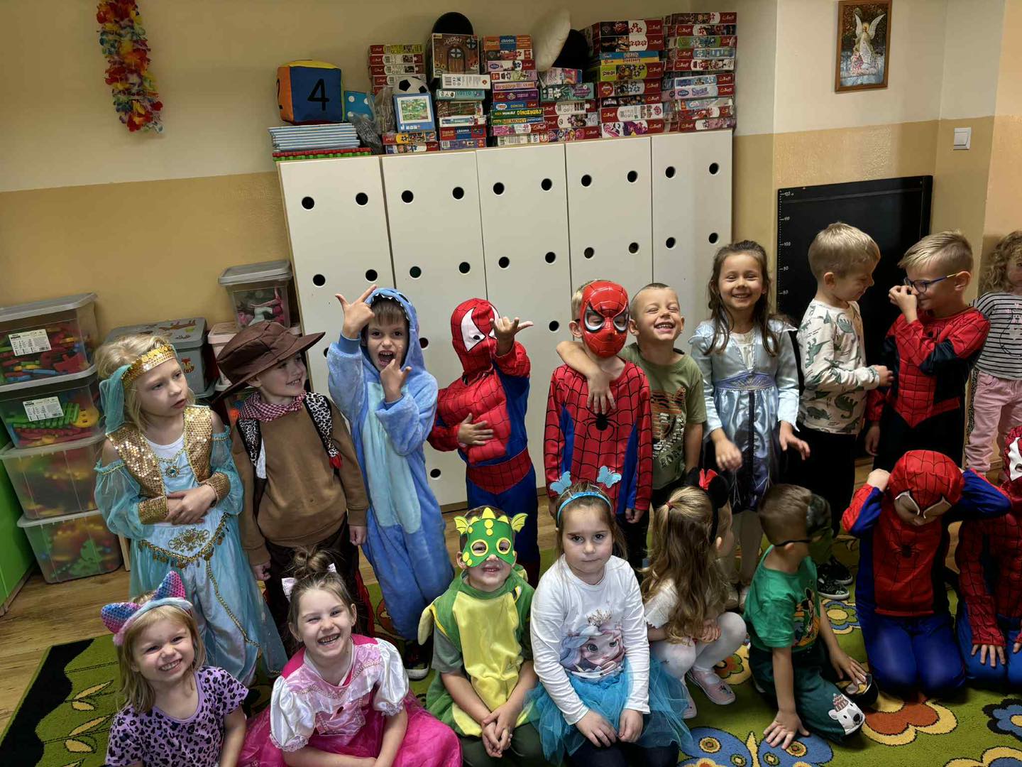 5 listopada 2025 obchodziliśmy Dzień Postaci z Bajek w grupie Biedronek i 6 latków. Dzieci uczestniczyły w zabawach tanecznych przy utworach z bajek.