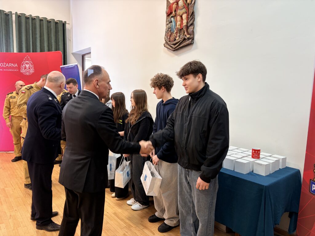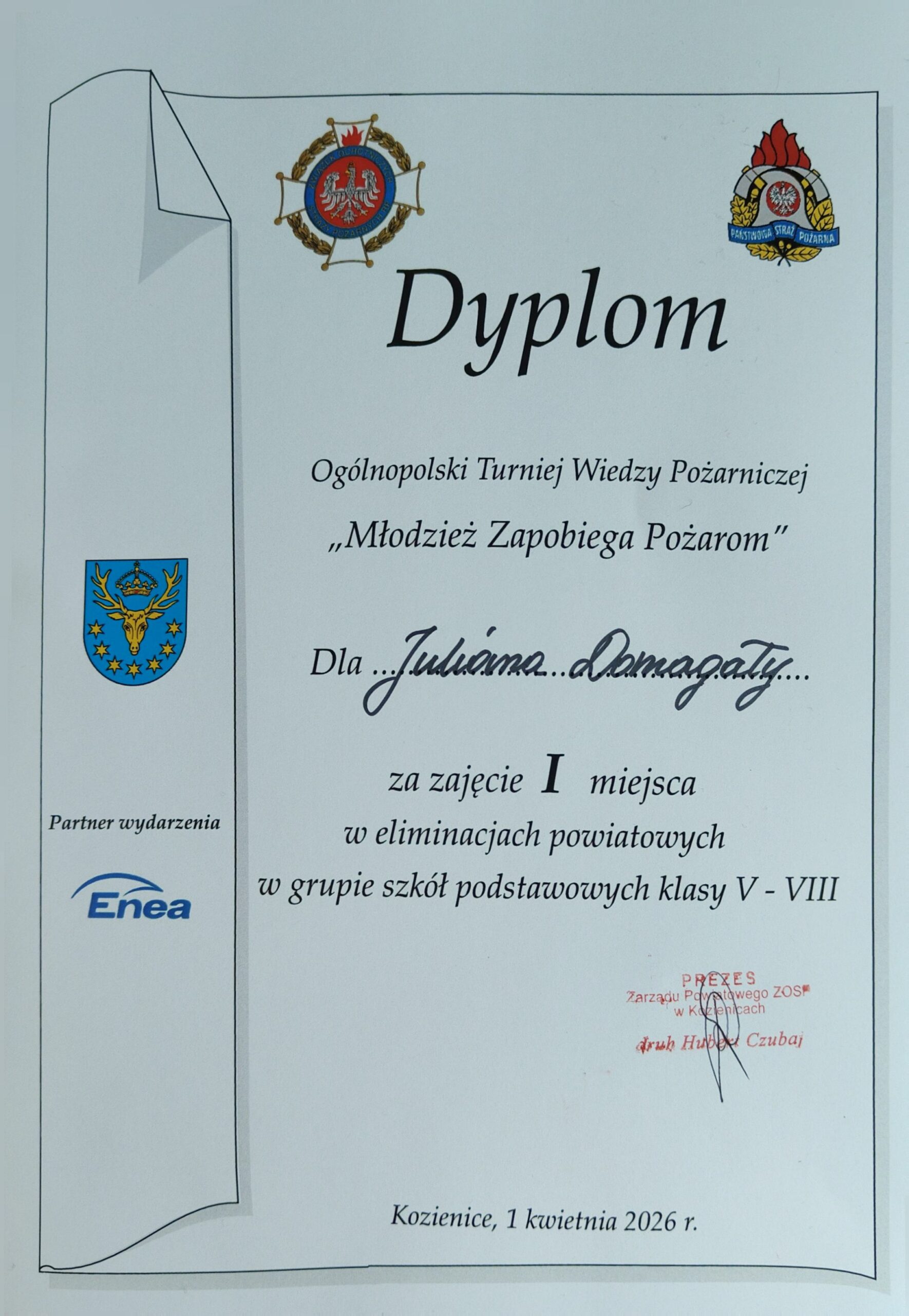 Uczeń naszej szkoły, Julian Domagała z klasy 8a, reprezentował placówkę w eliminacjach Ogólnopolskiego Turnieju Wiedzy Pożarniczej „Młodzież zapobiega pożarom”, które odbyły się 1 kwietnia 2026 roku w Komendzie Powiatowej Państwowej Straży Pożarnej w Kozienicach.