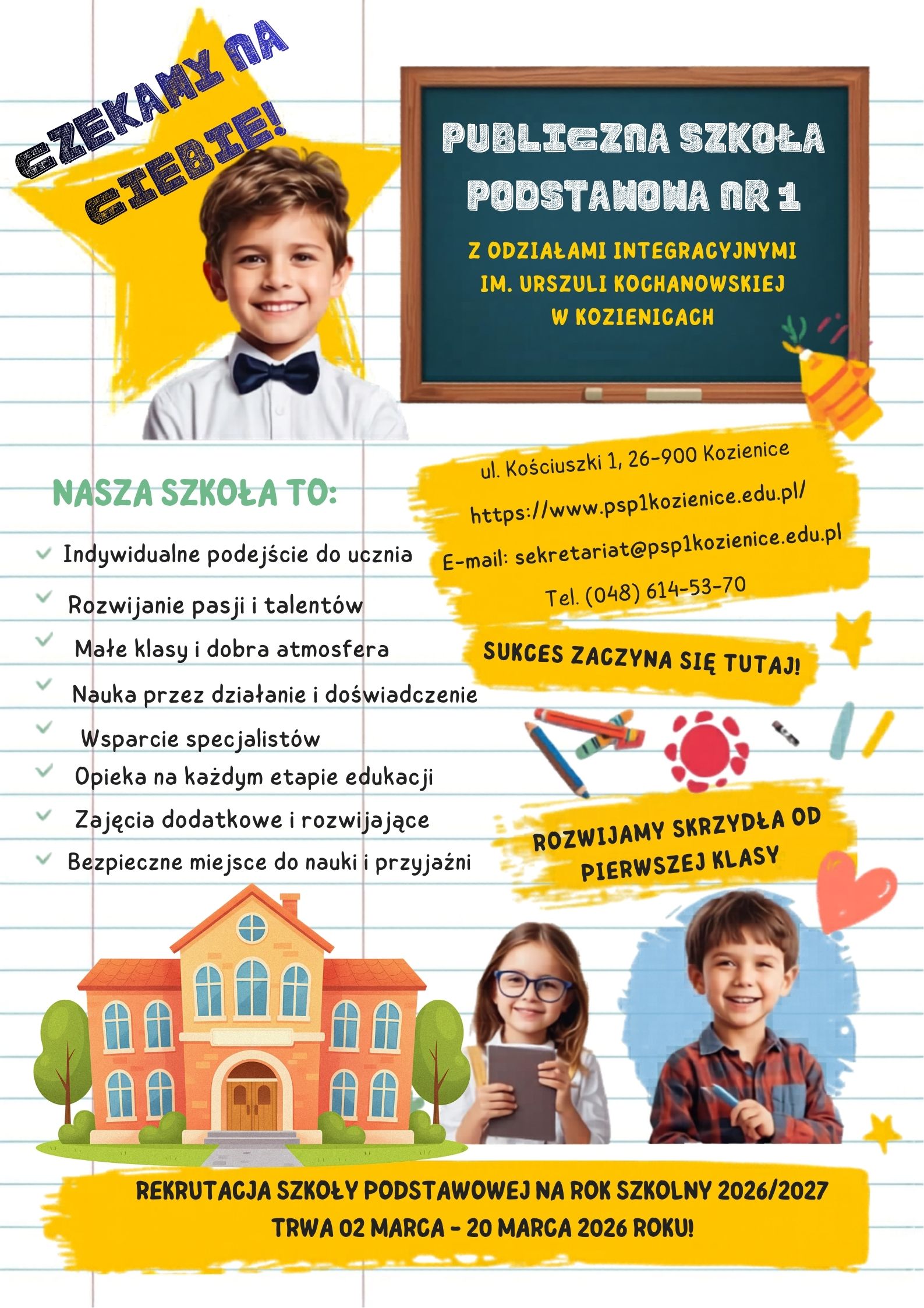 Tegoroczna rekrutacja do pierwszych klas szkół podstawowych Nr 1, 2, 3, 4 w Kozienicach oraz Publicznej Szkoły Podstawowej w Janikowie, prowadzona będzie przy wykorzystaniu elektronicznego systemu rekrutacyjnego. Jeżeli podjęliście Państwo decyzję, aby od 1 września 2026 roku Wasze dziecko rozpoczęło edukację w jednej z wymienionych szkół podstawowych, warto zapoznać się z zasadami tegorocznego naboru. Szczegółowe informacje, dane adresowe wraz z ofertą szkół, ważne terminy, a także kryteria obowiązujące przy przyjmowaniu dzieci do szkoły dostępne na stronie internetowej wybranej placówki lub stronie Urzędu Miejskiego w Kozienicach www.kozienice.pl.